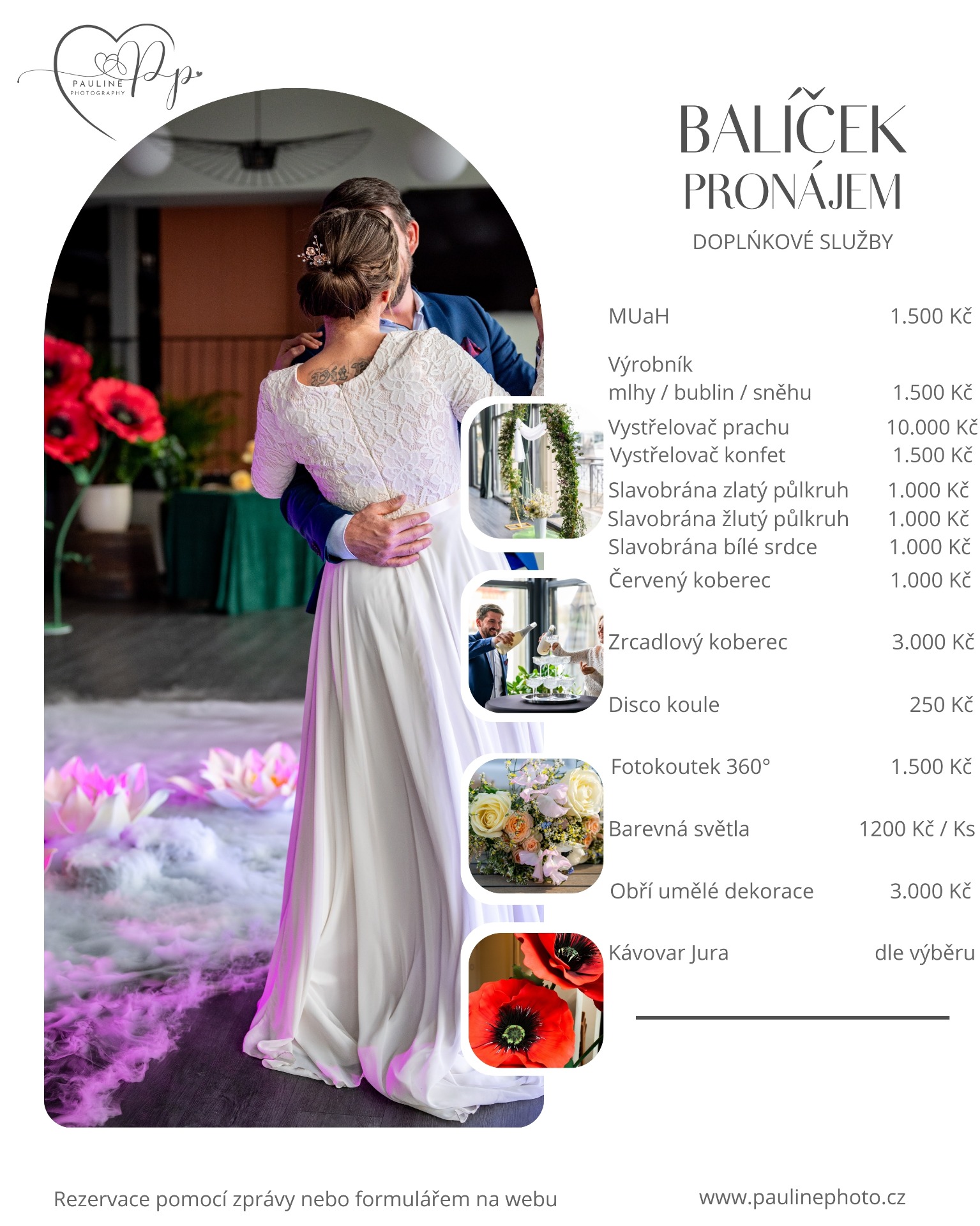 Za příplatek doplňkové služby dle vašeho výběru (služby MUaH / slavobrána / dort / bublifuk / konfety / mlha / sníh /červený nebo zrcadlový koberec / otočný fotokoutek 360°)